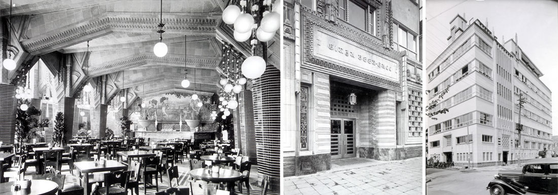 規模は35坪、入口から向かって左側にカウンターを設けニッケル製のスタンドを作り、床はリノリウム張り、イスやテーブルはビールの樽材でつくられ、また酒器はガラス製のジョッキで、当時としては極めてモダンな店でした。設計は工学博士である建築家の妻木頼黄氏に依頼し、奇抜な設計にしてもらった、と記録が残っています。